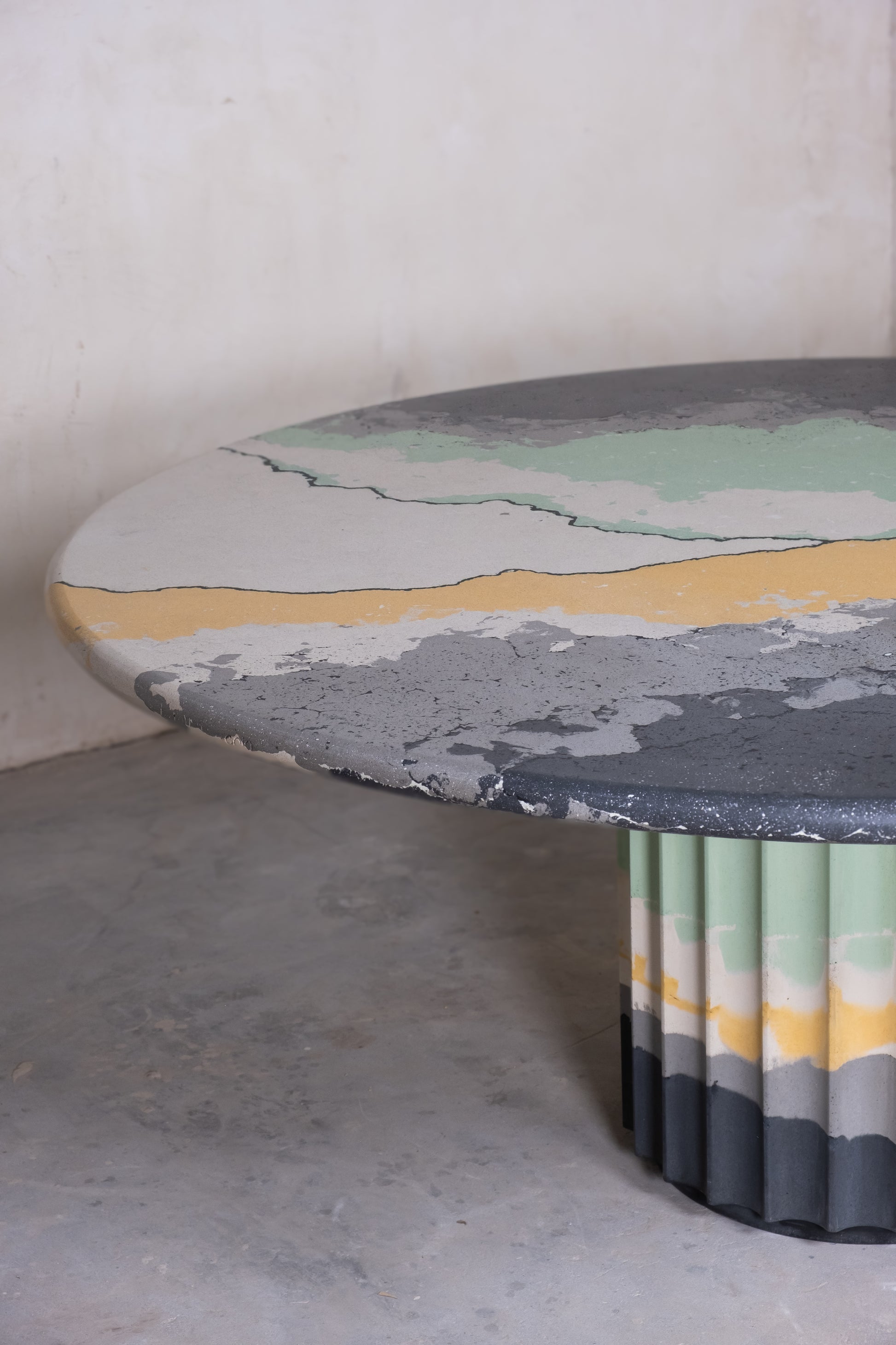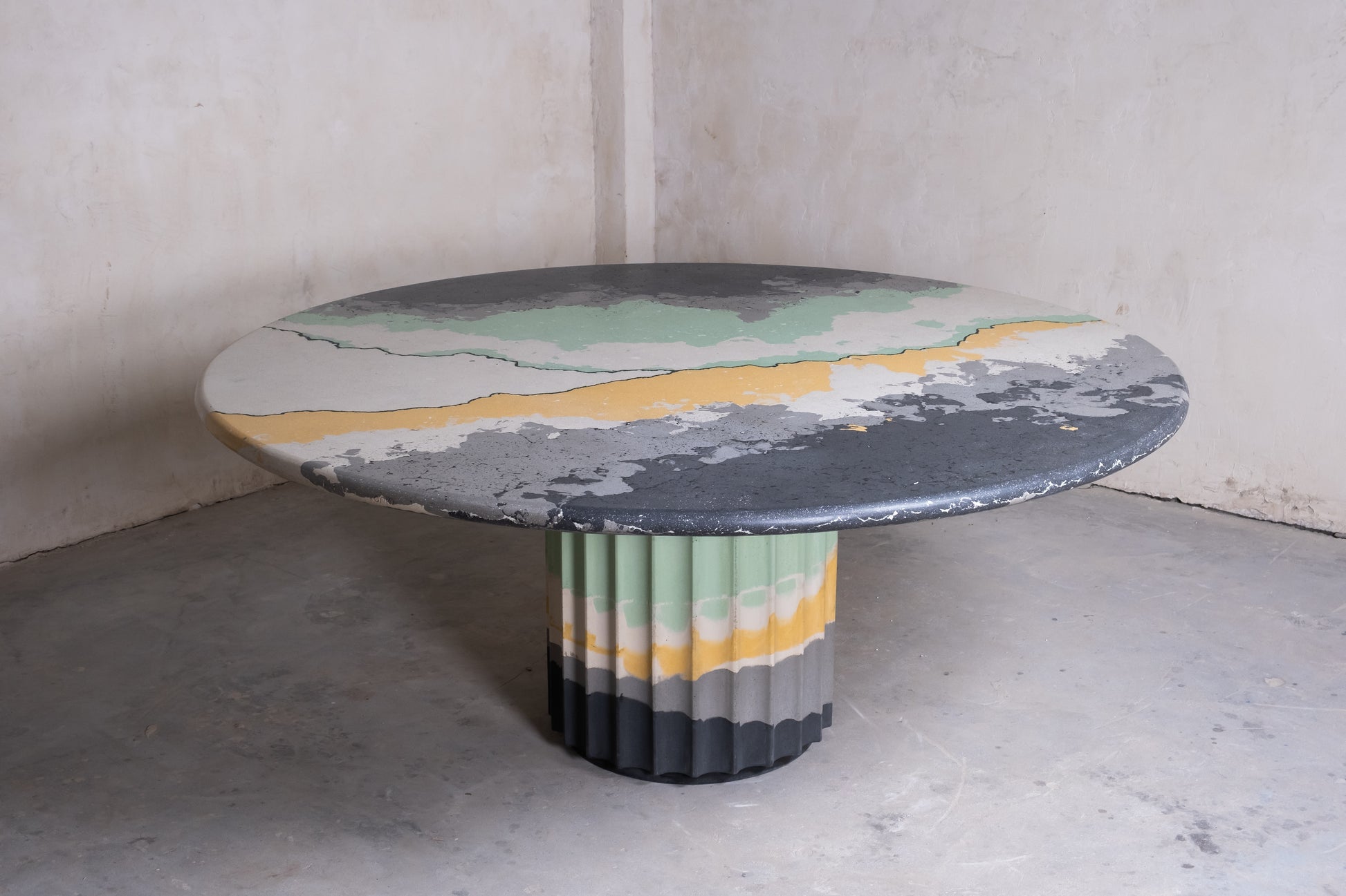 Breeze is a clean and calm statement piece, designed to feel universally appealing. Its palette of mint, lemon and charcoal blends softly through the concrete, creating a light, refreshing gradient with a gentle upward flow. The fluted base grounds the table with structure while carrying the same layered tones for a unified look. The result is a contemporary, easy-to-live-with table that brings colour, form and function together for everyday use.